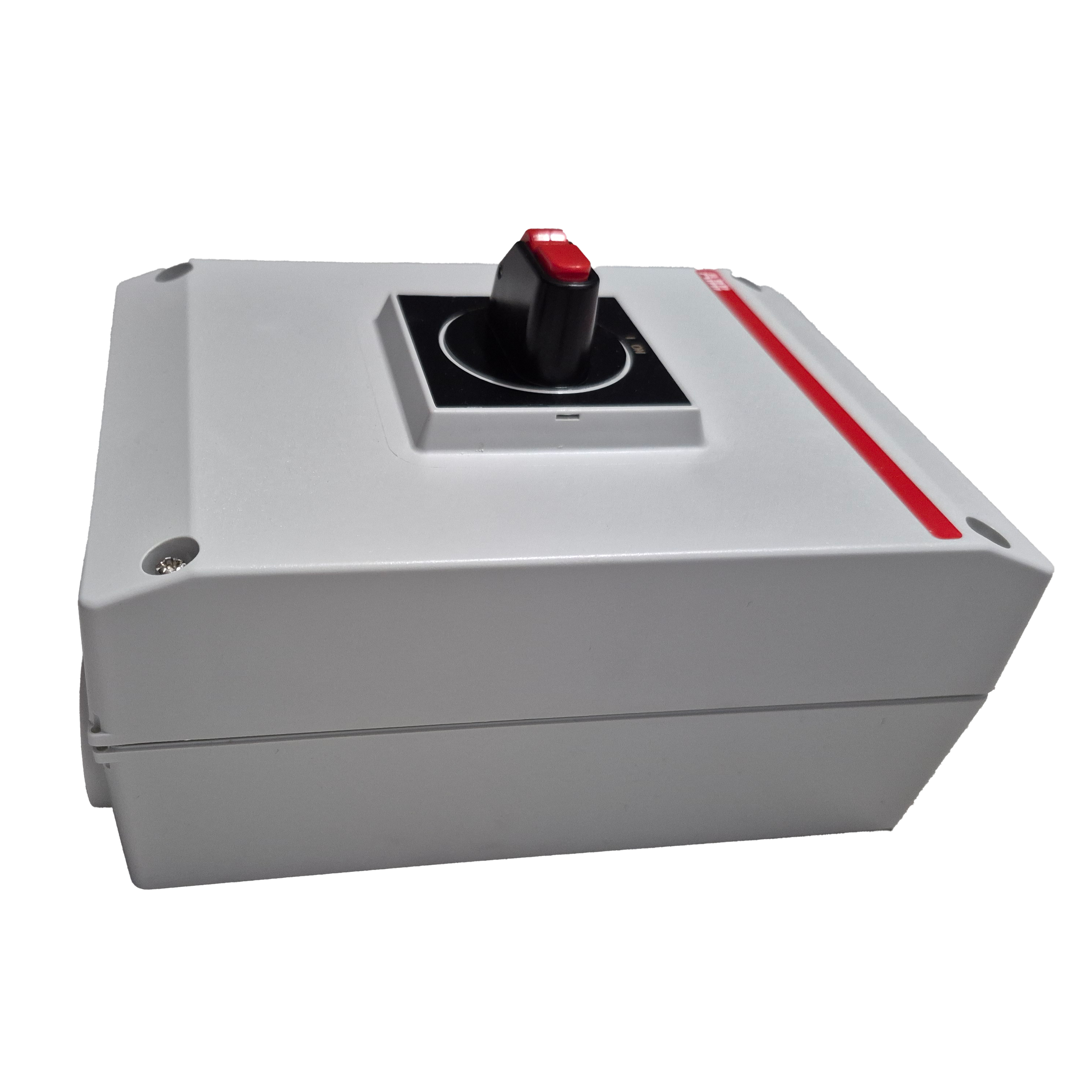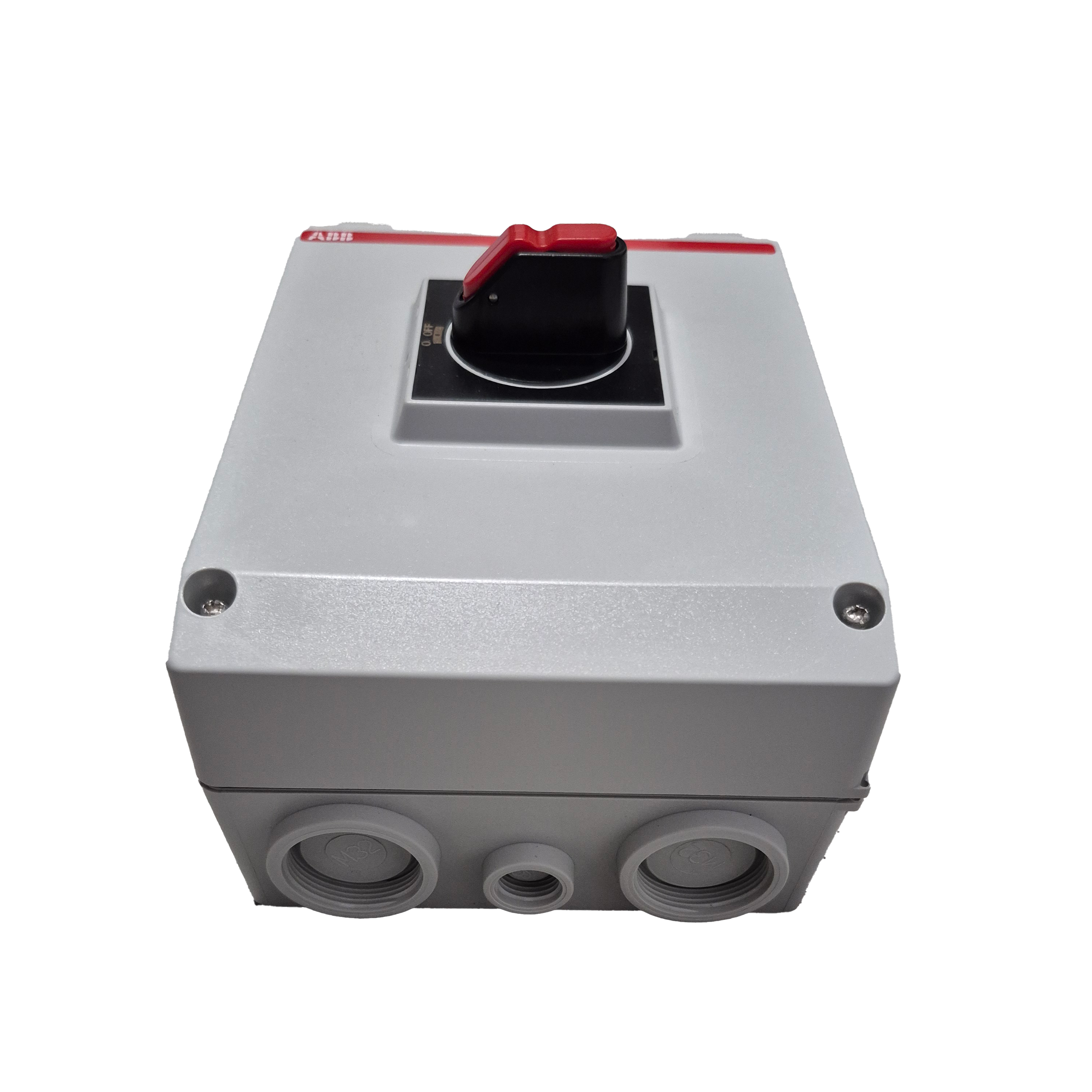 AC-frånskiljare för solcells-växelriktare. 25 A (AC-23A) vid 400 V, 3 poler + hjälpkontakt 1NO, IP65 kapsling. Väggmontage med frontmanövrering, glasfiberförstärkt polykarbonat. Mått 200×145×90 mm. För säker frånkoppling vid service/underhåll.