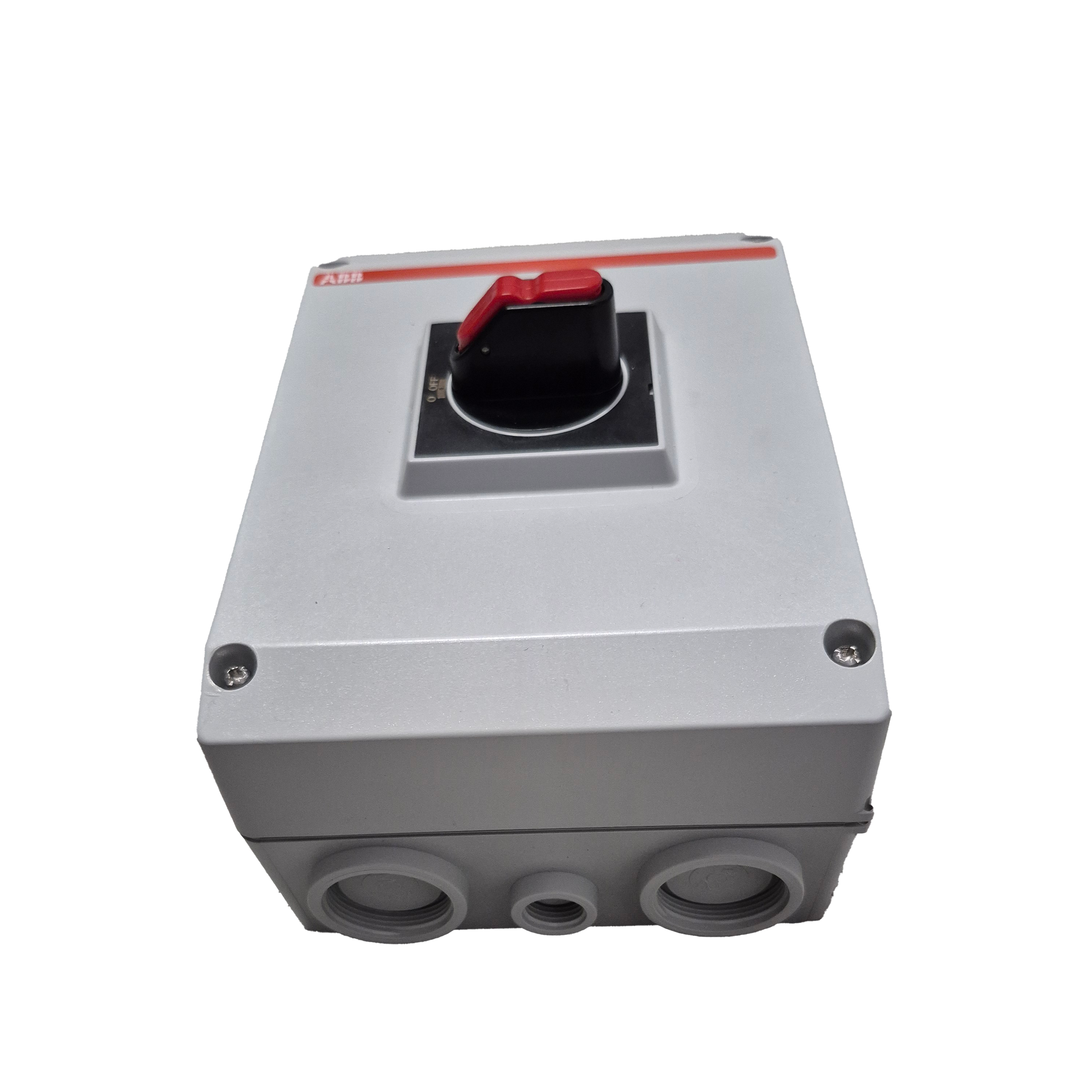 AC-frånskiljare för solcells-växelriktare. 36 A (AC-23A) vid 400 V, 3 poler + hjälpkontakt 1NO, IP65 kapsling. Frontmanövrerad väggmontage i glasfiberförstärkt plast. För säker frånkoppling vid service/underhåll.