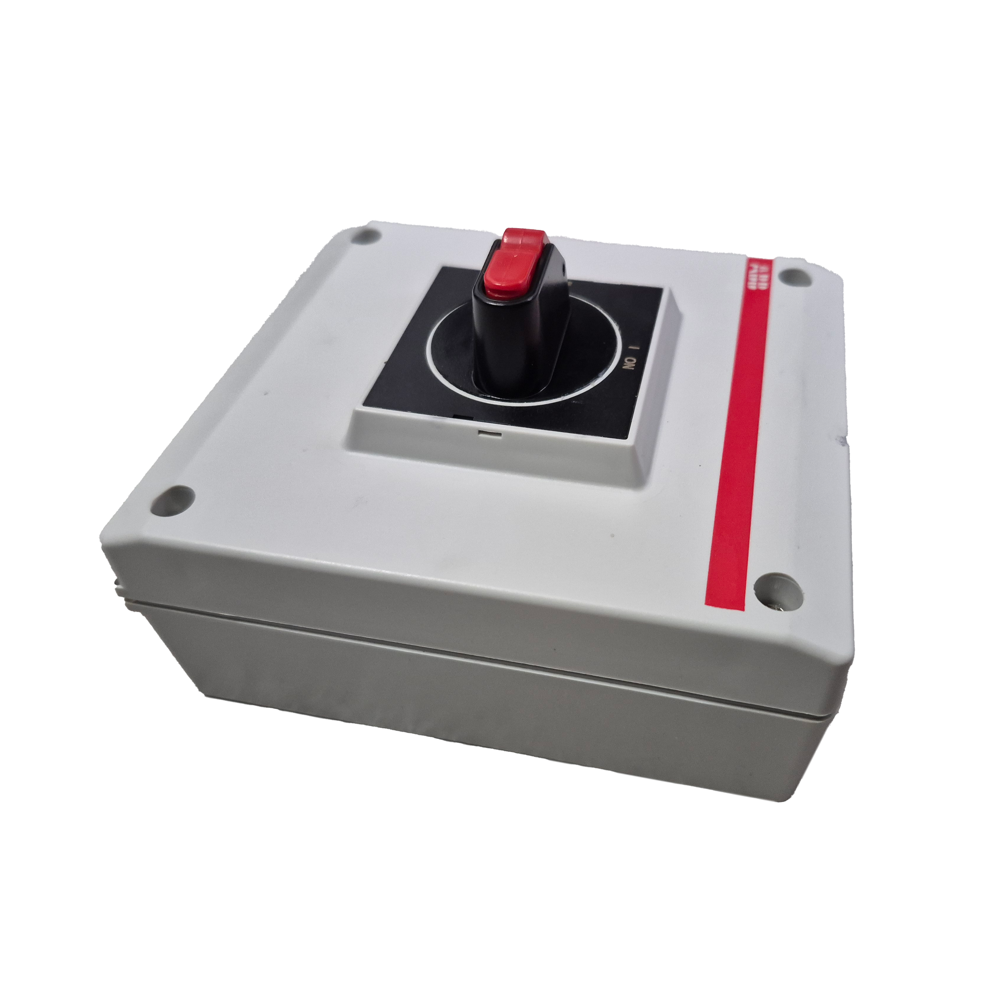 AC-frånskiljare för solcells-växelriktare. 16 A (AC-23) vid 400 V AC, 3-polig med hjälpkontakt 1NO, IP65 kapsling och låsbart svart vred. Panelmontage. Säker lokal frånkoppling vid service/underhåll.
