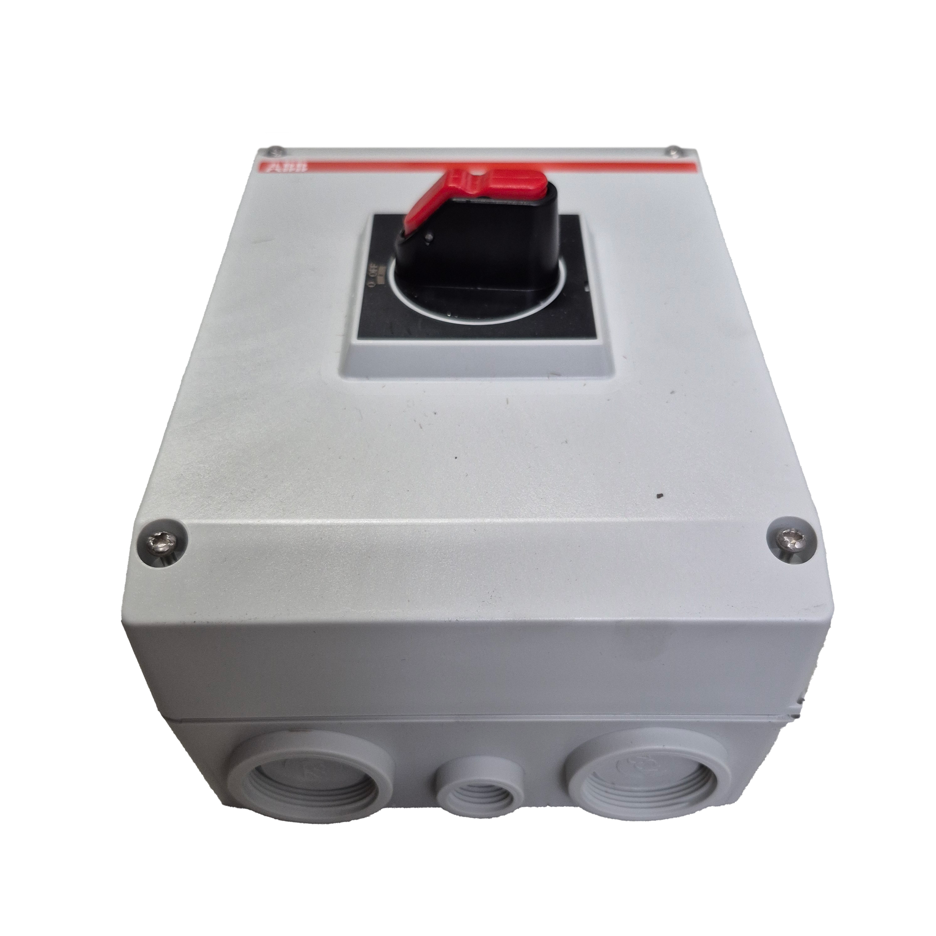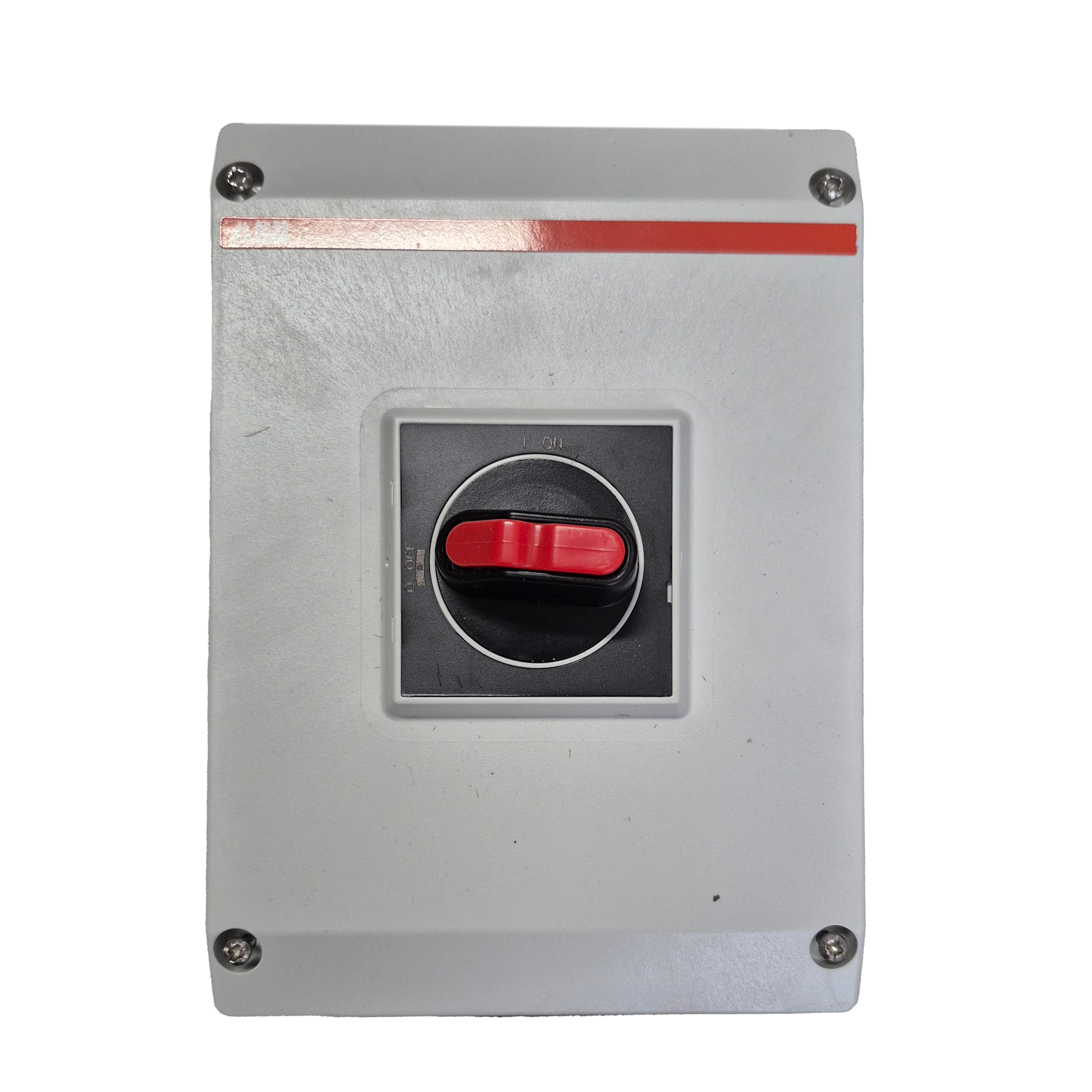 Robust AC-säkerhetsbrytare för snabb och säker frånkoppling av växelriktare vid service. 63 A vid 400 V AC, IP65, 3-pol+J, låsbar svart vred (upp till 3 hänglås), 2 × M32 kabelintag och skruvplint. Panelmontage.