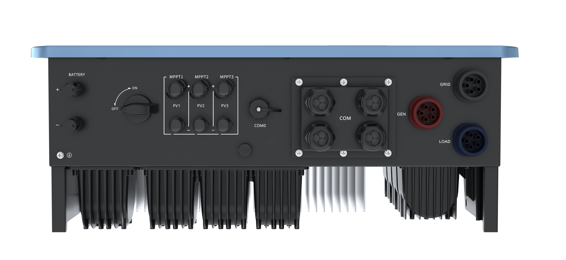 ASW12kH-T3 DG är en 3-fas hybridväxelriktare med asymmetrisk utgång, 3 oberoende MPPT och integrerad AFCI. Stöder batteri, backup (UPS < 10 ms) samt parallell drift on-grid och off-grid.